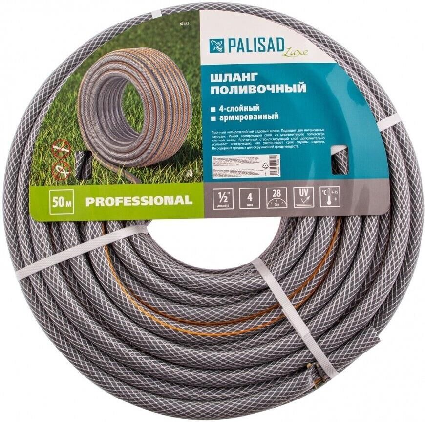 4-слойный армированный поливочный шланг Palisad LUXE «Professional» 67462 длиной 50 м и диаметром 1/2"" используется для организации системы полива на даче, в саду, скверах и небольших парках. С его помощью удобно проводить ежедневное орошение газонов и растений. Гибкий напорный шланг оптимально подходит для интенсивной эксплуатации.ПреимуществаВысокий ресурс — шланг выполнен из поливинилхлорида (ПВХ) наивысшего качества и армирован.Максимально прочный армирующий слой — полиэстерная нить с инновационным плетением обеспечивает стойкость к высоким нагрузкам, перегибам и скручиванию.Защита от внешних воздействий — специальное покрытие предотвращает разрушение шланга от перепадов температур и УФ-лучей.Повышенная прочность — за счет толщины стенок 2,2 мм шланг выдерживает давление до 35 бар.Универсальность — изделие совместимо со всеми поливочными системами Palisad и Palisad LUXE.