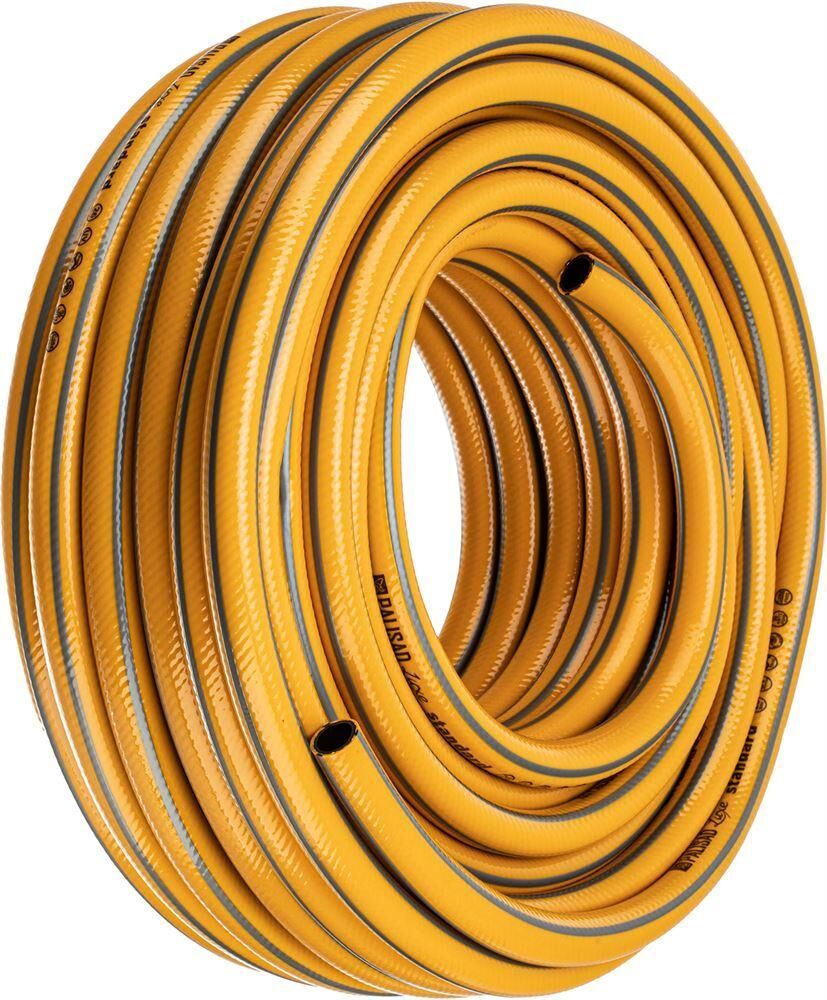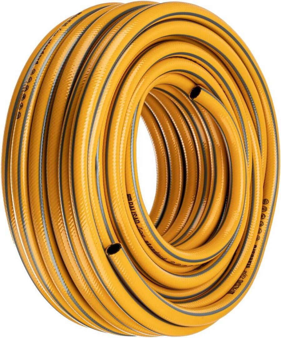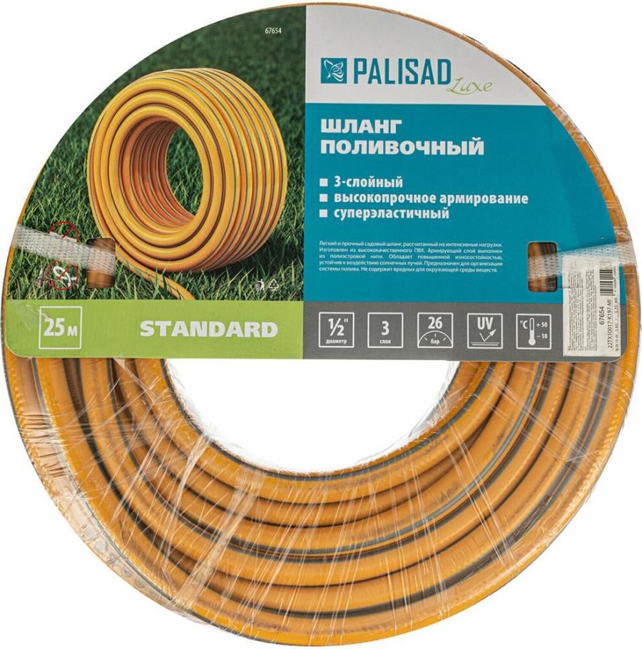 Шланг поливочный армированный 3-слойный Palisad LUXE «Standard» 67654 диаметром 1/2 дюйма и длиной 25 м применяется как для ручного, так и автоматического орошения газонов и насаждений. Используется в саду, на даче, в небольших парках, позволяет поддерживать жизнедеятельность растений без лишних усилий. Совместим с любыми системами полива Palisad и Palisad LUXE.ПреимуществаНадежность — шланг изготовлен из поливинилхлорида (ПВХ) наивысшего качества и армирован суперпрочной полиэстерной нитью.Безопасность для окружающей среды — ПВХ не содержит вредных веществ.Возможность интенсивного использования — даже высокая нагрузка распределяется равномерно за счет инновационного плетения полиэстерной нити.Защитное покрытие — шланг устойчив к воздействию ультрафиолетовых лучей и механическим повреждениям.Долговечность — шланг выдерживает высокие разрывные нагрузки до 30 бар, а благодаря эластичности быстро возвращает свою форму, не скручивается и не заламывается.Длина 25 м — шланг оптимально подходит для орошения средних