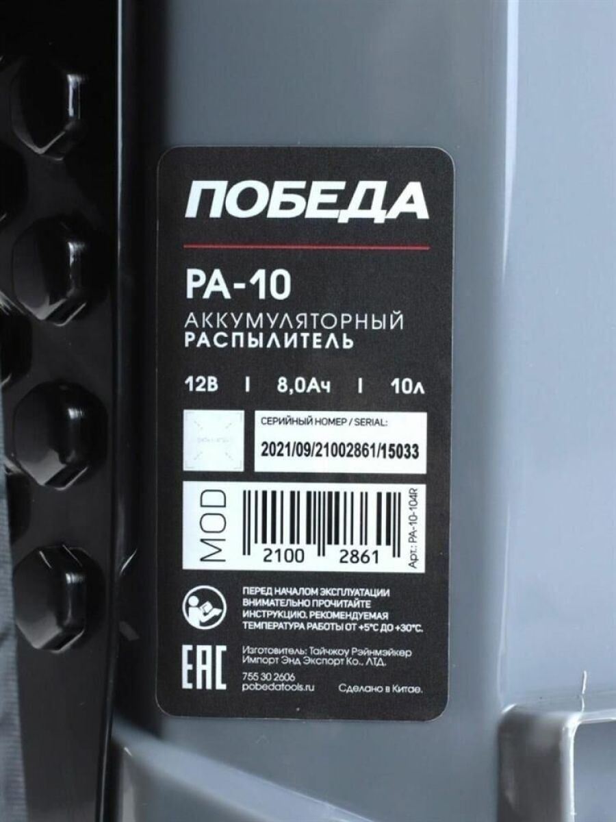 Производительность: 2 л/мин. Макс. рабочее давление насоса: 3 Бар. Объем резервуара: 10 л. Напряжение аккумулятора: 12 В. Емкость аккумулятора: 8 А/ч. Тип насоса: диафрагменный. Гарантия: 1 год. ВхШхГ упаковки: 42х33х18 см. Вес брутто упаковки: 4,6 кг. Объем упаковки: 0,024948 куб. м. Комплект поставки: опрыскиватель, форсунка распылительная: 3 шт., зарядное устройство, трубка удлинительная: 2 шт., рукоятка, шланг, инструкция.