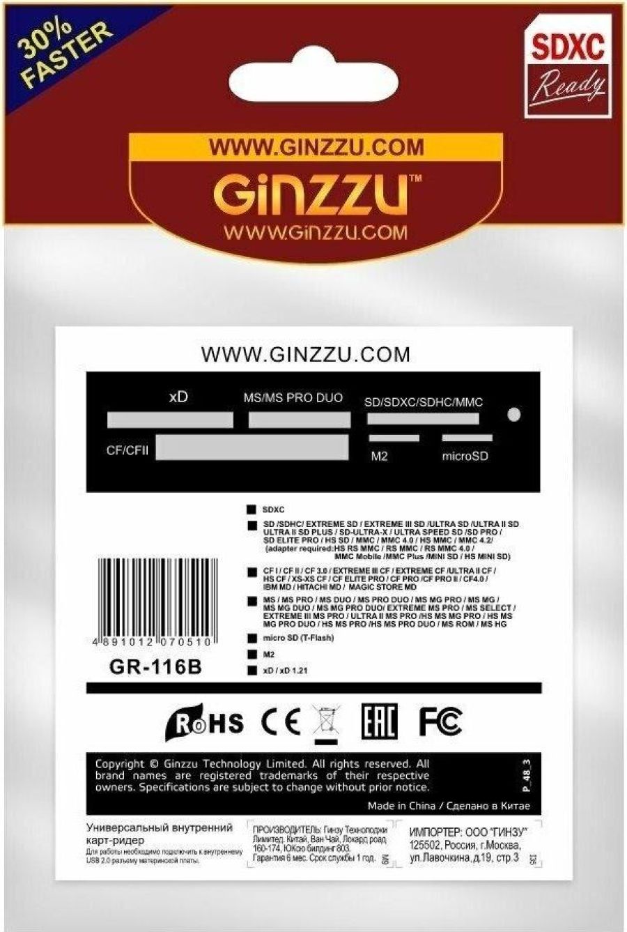 Внутренний картридер 3.5". Корпус из пластика. Поддержка формата SDXC. 6 слотов для флэш-карт памяти.