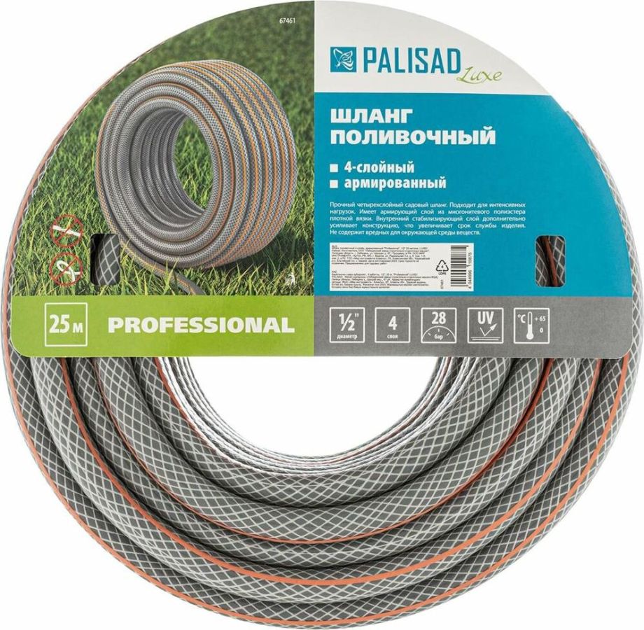 PALISAD Шланг поливочный 4-слойн. армированный "PROFESSIONAL", 1/2" 25 метров Шланг поливочный 4-слойн. армированный POLISAD "Professional" Предназначен для орошения почвы на садовых и парковых участках. Изготовлен из ПВХ высокого качества.Материал армирующего слоя - полиэстерная нить. Имеет высокую прочность, гибкость и устойчивость к перепадам температур. Устойчив к ультрафиолетовым лучам. Рассчитан на эксплуатацию в условиях интенсивных нагрузок. Максимальная нагрузка - 30 бар. Диапазон рабочих температур от –20 до +60 °С. Не содержит вредные для окружающей среды вещества. Совместим со всеми элементами системы полива PALISAD и PALISAD Luxe.