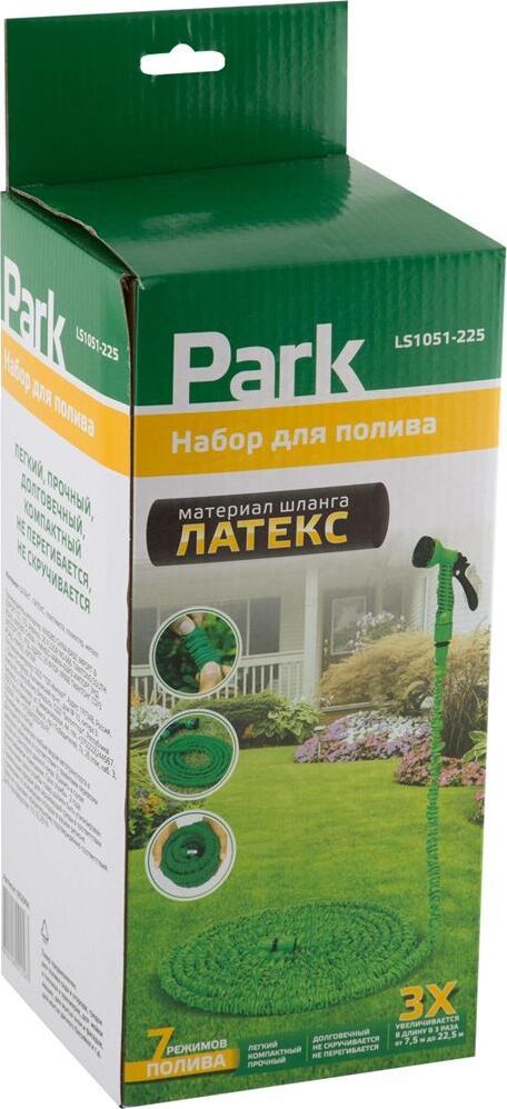 Комплектация: адаптер с переходником 1/2" и 3/4", пистолет для полива (7 режимов полива), шланг с двумя соединителями