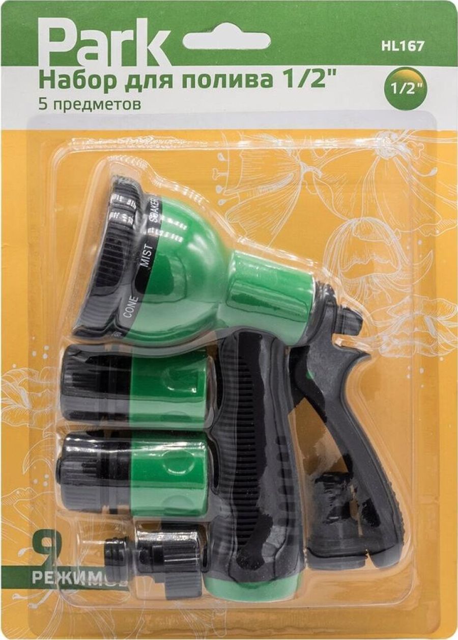 Пистолет для полива (HL118-1); соединитель 1/2" с автостопом (HL029); соединитель 1/2" (HL031); адаптер 3/4" с внутренней резьбой (HL012). Материал: ударопрочный ABS пластик, резина.