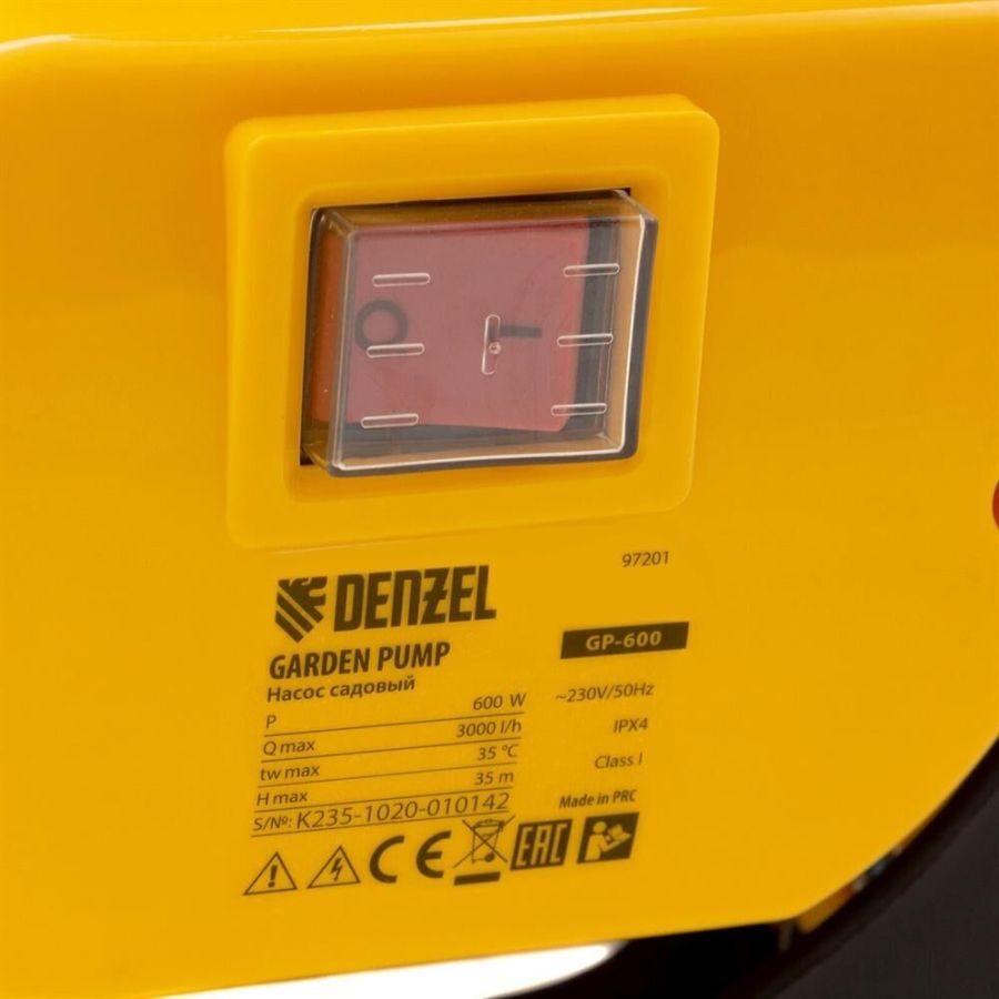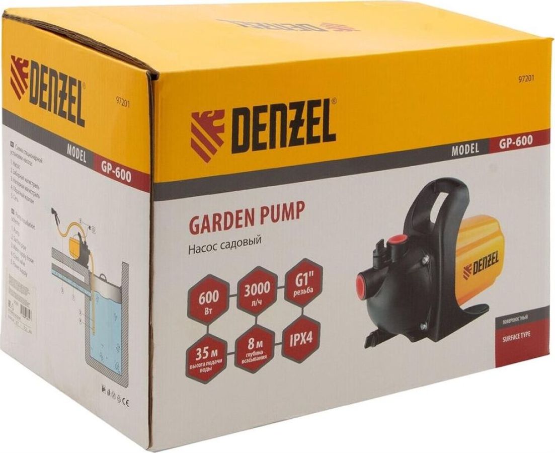 Бытовой садовый насос GP600 торговой марки Denzel предназначен для полива садов, огородов, приусадебных участков, а также для водоснабжения жилых домов и подъема воды на высоту до 35 м. Забор воды насосом возможен из открытых водоемов, колодцев и прочих накопительных емкостей. Максимально возможная глубина опускания всасывающего шланга не более 8 м, максимальное давление подачи воды 4,4 бар. Производительность насоса составляет 3000 л/час.