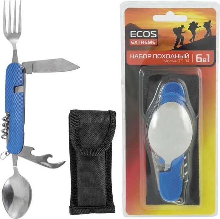Состав набора: нож, открывалка для бутылок, консервный нож, вилка, ложка, штопор. Набор разъединяется, что позволяет использовать одновременно и нож и вилку для приема пищи. Материал — нержавеющая сталь. В комплекте нейлоновый чехол.