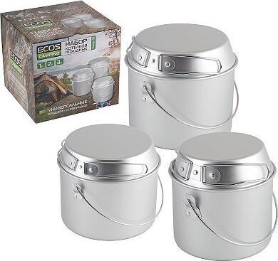 в комплект входит: * котелок 1.2 л с крышкой-сковородой Толщина стенок: 0,7 мм * котелок 1.8 л с крышкой-сковородой Толщина стенок: 0,7 мм * котелок 3 л с крышкой-сковородой Толщина стенок: 0,75 мм * чехол из нейлона Может использоваться на костре ил