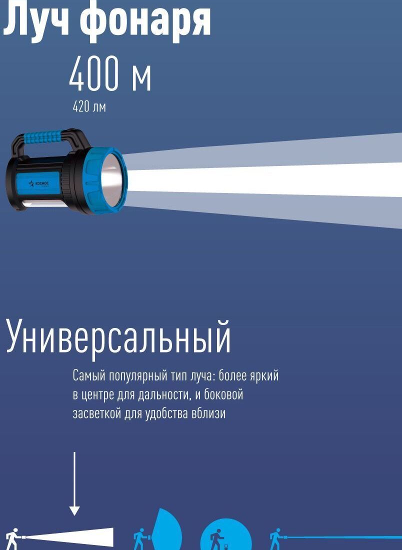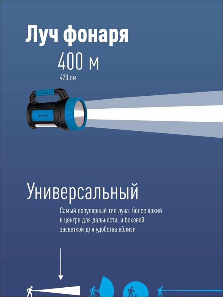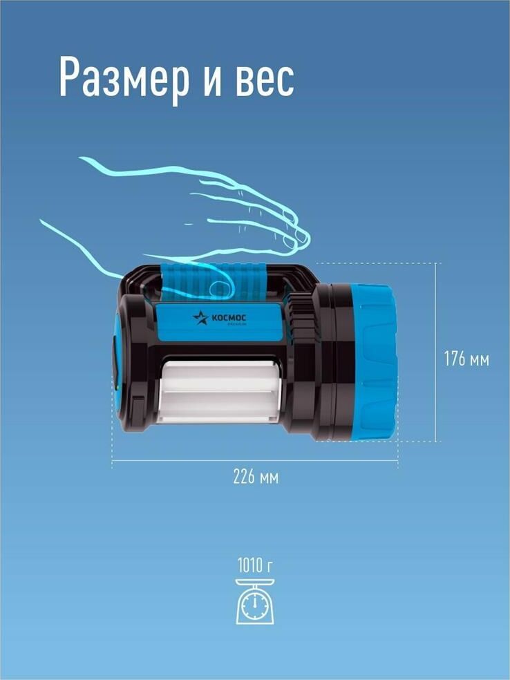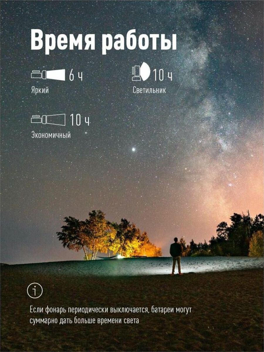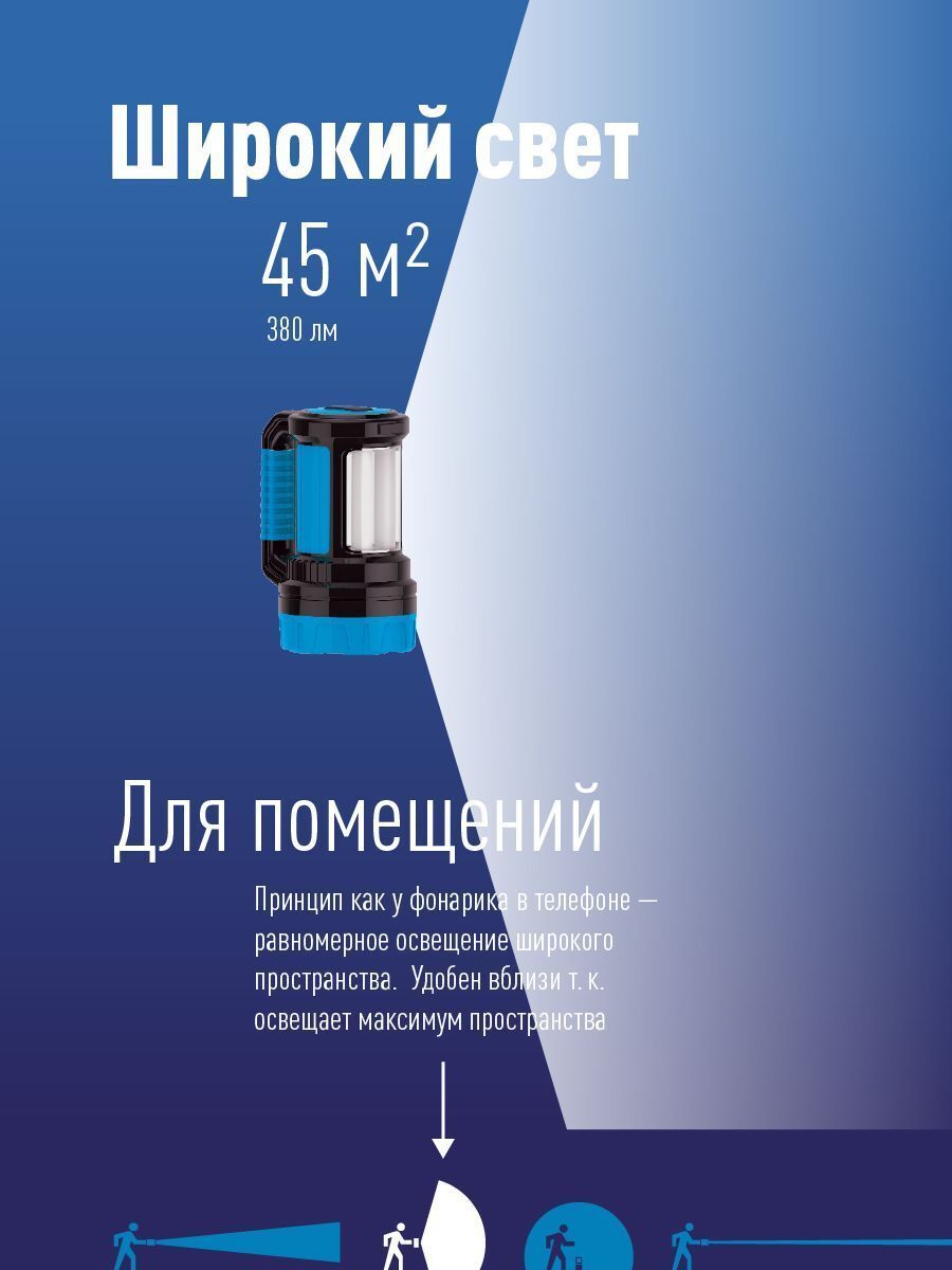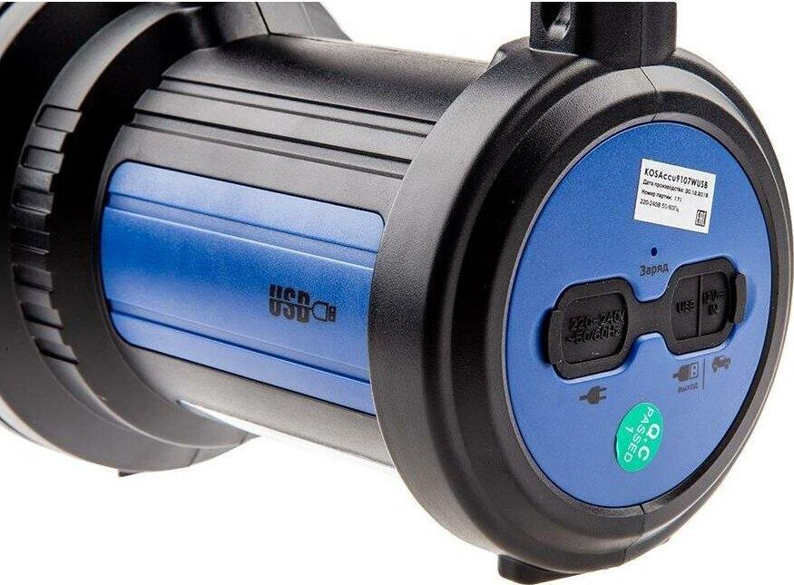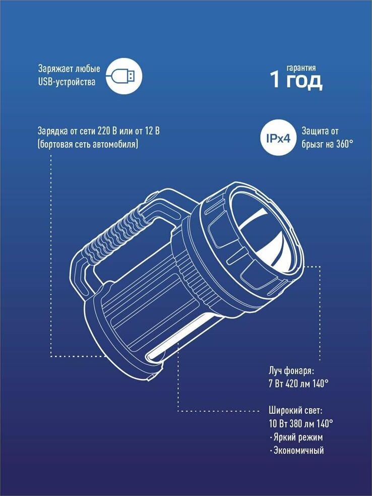 Встроенный powerbank - USB-разъём для зарядки любых мобильных устройств; Мощный светодиод 7 Вт - это 420 лм света. Хватит, чтобы осветить до 400 метров; Встроенный боковой светильник 380 лм по мощности не уступает полноценным фонарям-светильникам - освещение 45кв.м. Чтобы обеспечить работу всех этих функций, в корпусе стоит ёмкий аккумулятор, который в экстренном случае даст до 10 часов света в экономичном режиме Всё это во влагостойком корпусе, который выдержит любой ливень. А так же гнездо на 12В, для экстренной подзарядки в автомобиле.