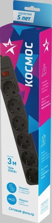Сетевой фильтр Космос защищает Вашу технику от выхода из строя из-за "некачественного" тока: защита от многоразовых перегрузок и замыканий. Максимальная мощность 3500 Вт. Для одновременного и безопасного подключения девайсов всей семьи: от домашнего кинотеатра до домашнего офиса. 100% медный трехжильный кабель с сечением 1,00мм, пожаробезопасный корпус. индикатор сети. Номинальный ток 16А. 220В. предохранитель - биометаллический размыкатель. Цвет чёрный