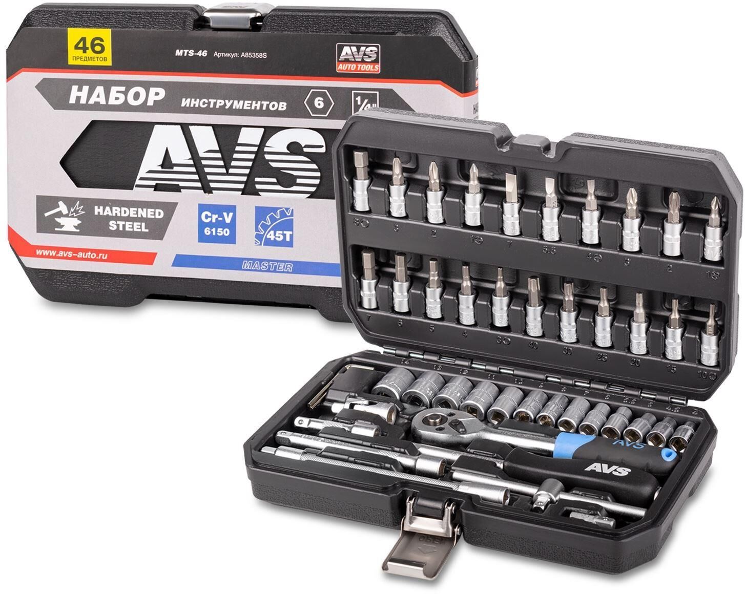 Набор инструментов AVS предназначен для ремонта и обслуживания автомобиля. Трещотка оснащена храповым механизмом на 45 зубцов и имеет двухкомпонентную эргономичную рукоять. В набор входит 46 предметов. Состав набора указан на упаковке. Прочный кейс для удобного хранения и транспортировки. Привод 1/4“ DR • Головка торцевая 6-гранная: 4, 4.5, 5, 5.5, 6, 7, 8, 9, 10, 11, 12, 13, 14 мм; • Головка со вставкой TORX: Т10, Т15, Т20, Т25, Т30, Т40; • Головка со вставкой шестигранной: Н3, Н4, Н5, Н6, Н7, Н8; • Головка со вставкой шлицевой: SL4, SL5.5, SL7; • Головка со вставкой крестовой: PH1, РН2, РН3; • Головка со вставкой POZIDRIV: PZ1, PZ2, PZ3; • Рукоятка трещоточная 45 зубцов; • Удлинитель: 50, 100 мм; • Отверточная рукоятка 150 мм; • Вороток Т-образный 115 мм; • Карданный шарнир; • Адаптер-переходник для бит; • Удлинитель гибкий 150 мм; • Ключ шестигранный Г-образный: 1.27, 1.5, 2, 2.5 мм. Материал - закаленная углеродистая сталь Покрытие - матовое хромированное Вес: 1,45 кг