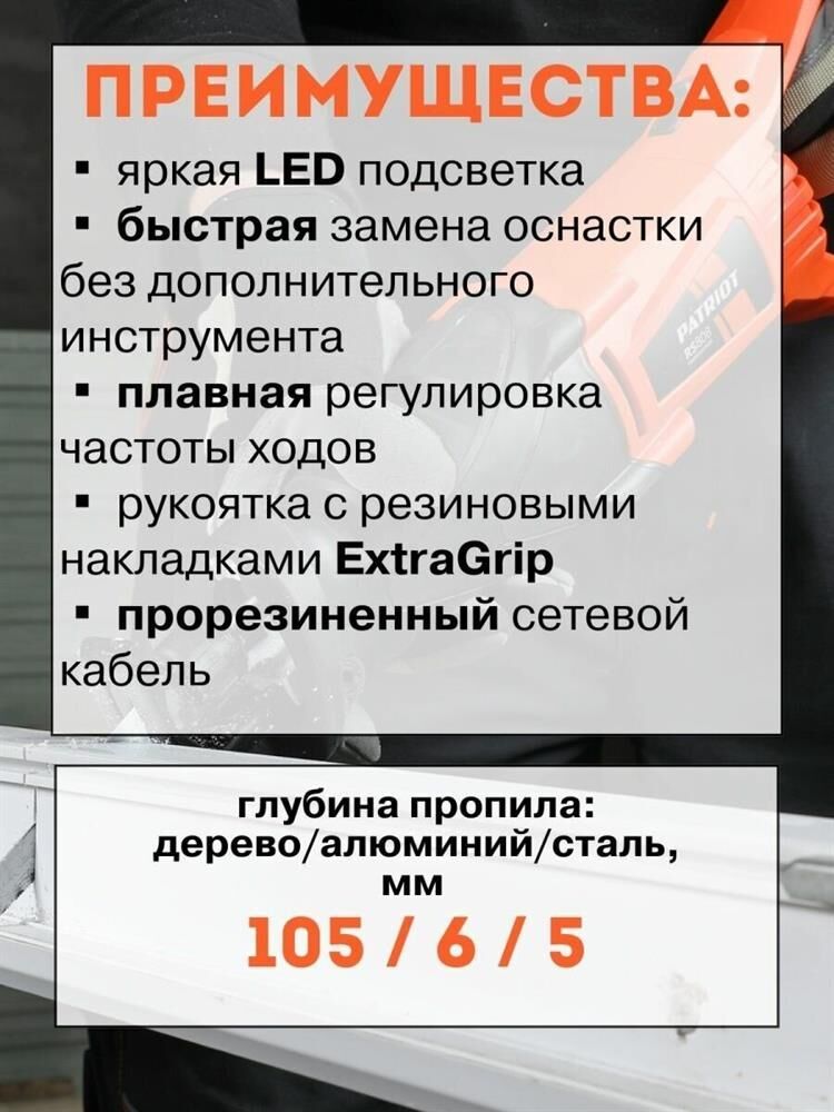 Амплитуда хода пилки, мм 28, Длина пильного полотна, мм 150, Глубина пропила (дерево/алюминий/сталь), мм 105/6/5, Регулировка скорости, положений 6, Потребляемая мощность, Вт 850, Наличие подсветки, Быстрая замена пилки, Прорезиненная рукоятка, Прорезиненный морозостойкий кабель.