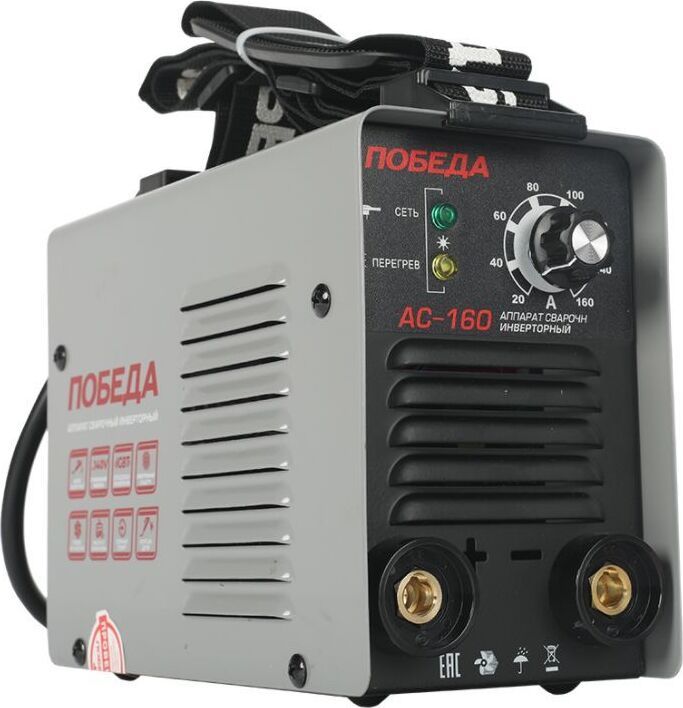 Сварочный аппарат инверторный, входное напряжение 1ф - 220В, потребляемая мощность - 3.9 кВА, сварочный ток мин/макс - 20/160А, ПВ-60%, диаметр электрода - 1.6/4 мм, комплектация: держатель электрода, клемма-земля. Функция антизалипания, горячий старт, жесткость дуги. Ремень для переноски. Вес 4.6 кг.