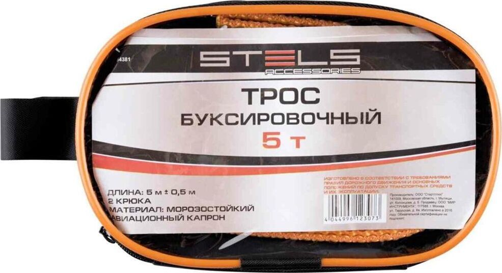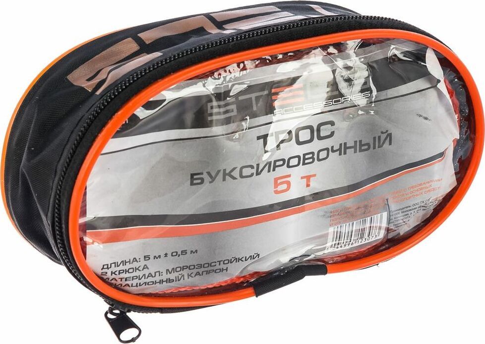 Трос буксировочный 5 т, 2 крюка, сумка на молнии. Основные преимущества тросов STELS: Тросы буксировочные изготовлены из морозоустойчивого авиационного капрона. Не подвержены воздействию окружающей среды (резкому изменению влажности и температуры. На протяжении всего срока службы не меняют свои линейные размеры. Имеют удобную индивидуальную упаковку для транспортировки и хранения. Изготовлены согласно требованиям правил дорожного движения и основных положений по допуску транспортных средств к эксплуатации.