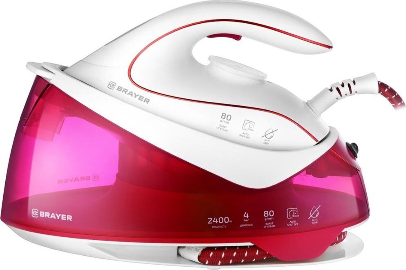 Максимальная мощность 2400 Вт Двуслойное керамическое покрытие подошвы, обеспечивающее равномерное распределение температуры Постоянная подача пара: 80 г/мин Готовность к работе 1,5 мин Объем резервуара для воды 0,9 л Давление 4 бар Вертикальное отпаривание Автоматическое отключение Плавная регулировка температуры Встроенная система защиты от накипи Функция самоочистки Функция разбрызгивания Длина шнура 1,8 м Электропитание 220-240 В, ~ 50/60 Гц