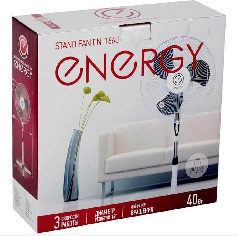 ENERGY EN-1660 (напольный) 16" белый Диаметр 16" Подставка 52*52см Высота 1,25м Лучевая решетка 3 скорости Регулировка наклона Функция поворота Мощность 40Вт 1 шт./коробка