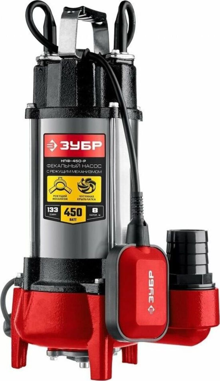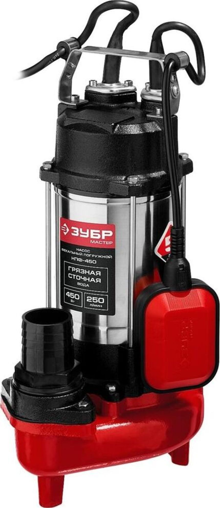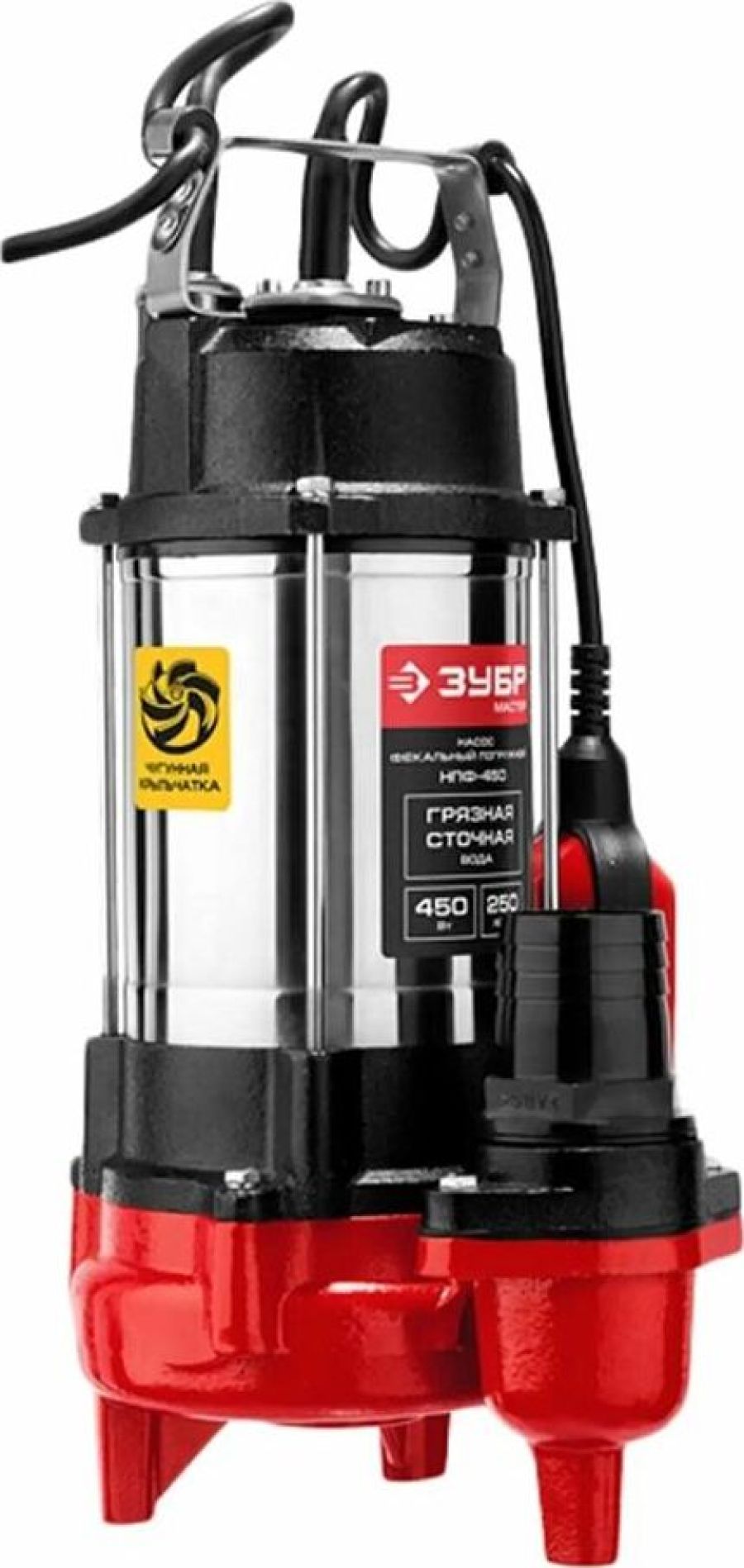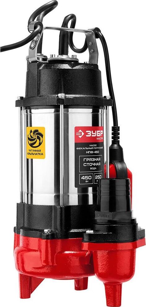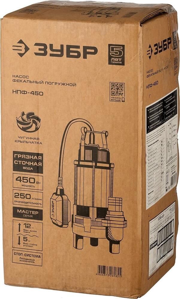 Фекальный погружной насос Зубр НПФ-450 отличается простой и надежной конструкцией. Используется для откачивания воды из выгребных ям, котлованов, сильно загрязненных септиков и подвалов. В состоянии пропускать твердые частицы диаметром до 25 мм. Предусмотрен внешний поплавковый выключатель. Модель может быть использована в агрессивной среде. Технические характеристики Зубр НПФ-450 Высота подъема, м 12 Габариты, мм 260х205х465 Глубина погружения, м 5 Мощность, Вт 450 Производительность, л/мин 250 Тип фекальный Вид погружной Защита от сухого хода поплавковый выключатель Наличие измельчающего ножа нет Соединитель в комплекте елочка 2 Длина кабеля, м 5 Остаточный уровень воды, мм 60 Класс защиты IP68 Напряжение, В 220 Серия НПФ Конструкция центробежный Материал корпуса сталь/чугун