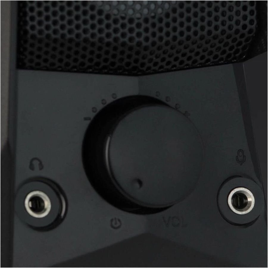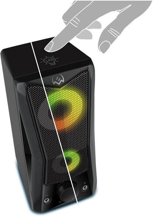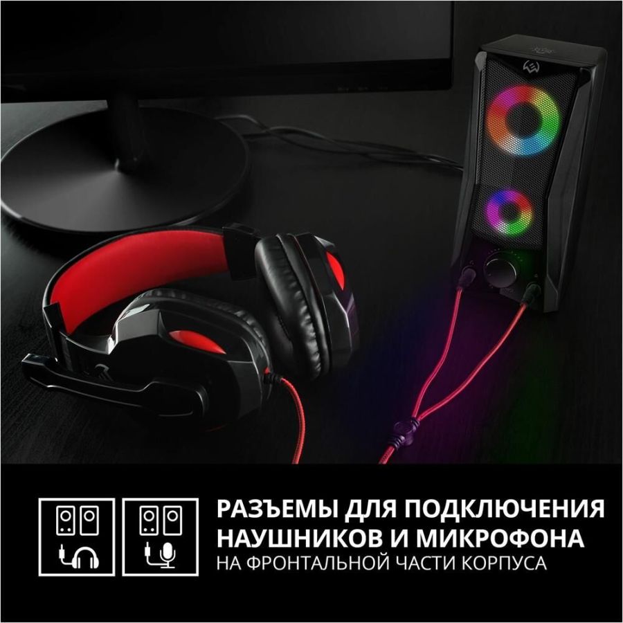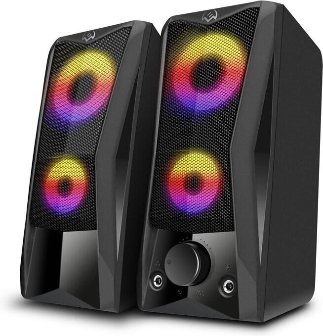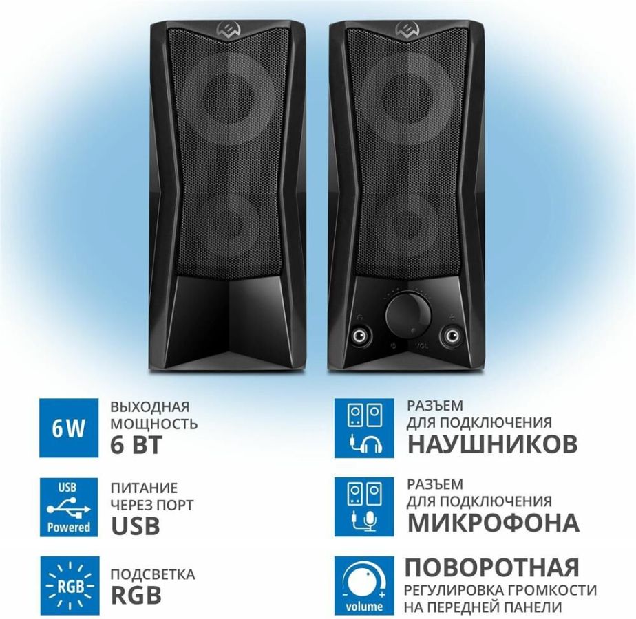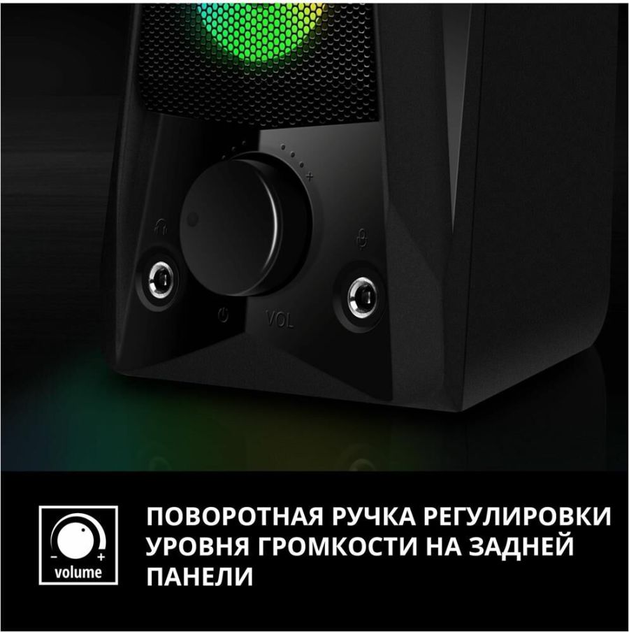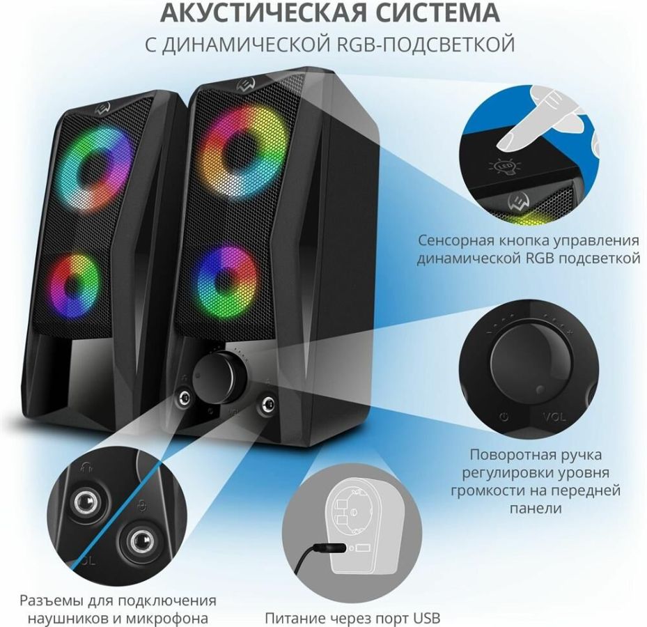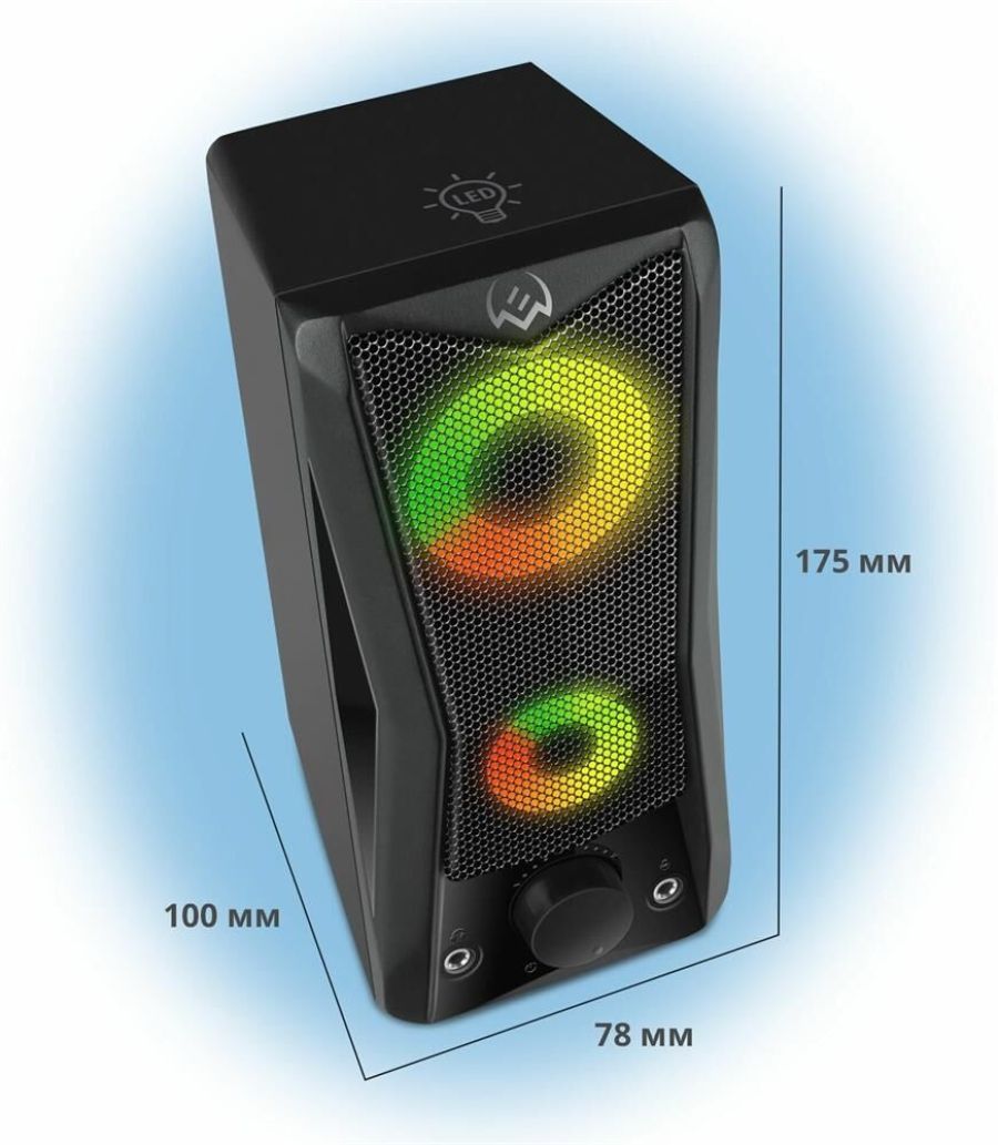 Эти динамики не только дают мощный звук, они взрываются цветом! Разноцветная светодиодная динамическая подсветка в сочетании с матово-черным корпусом отлично вписывается в любую конфигурацию игровой станции. На передней панели каждой колонки находятся два переливающихся светящихся круга. Подсветку можно выключить с помощью сенсора на верхней панели. Звуки игрового мира в сочетании со световыми эффектами мгновенно изолируют вас от реальности. Вы гарантированно получите весь спектр впечатлений! Выходная мощность (RMS): 6 Вт. Частотный диапазон: 90 – 20 000 Гц. Размеры динамиков: 65 мм. Напряжение питания: USB/DC 5V. Материал корпуса: ABS-пластик. Размеры изделия: 78*175*100 мм. Вес: 750 г.