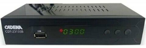 СтандартыDVB-T2 Пульт ДУЕсть Комплектация Цифровой эфирный приемник Cadena CDT-2315SB – 1шт., Пульт ДУ – 1 шт., Элемент питания 1,5В AAA – 2 шт., Шнур 3RCA-3RCA - 1шт., Руководство пользователя (гарантийный талон внутри) – 1шт.. Прием DVB-T2Есть