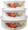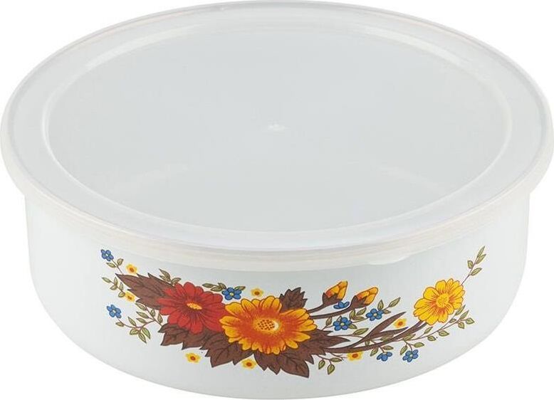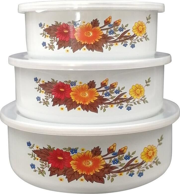 Набор из 3 эмалированных мисок с крышками, FAMILIA, объемы: 600/850/1250 мл, цвет: белый с дизайном Материал: углеродистая сталь, 2 слоя эмали, нерж сталь (ободок), крышка из полипропилена; прямой формы, внутри и снаружи белые с народным дизайном. Размеры: 14*5,3 см — 600 мл; 16*5,5 см — 850 мл; 18*6,35 — 1250 мл. Упаковка: ЦВЕТНАЯ КОРОБКА. Толщина 0,78 мм. *Не рекомендуется мыть в посудомоечной машине, мыть теплой водой с мягким моющим средством. Назначение: для хранения продуктов. Рекомендовано хранение продуктов в холодильной камере.