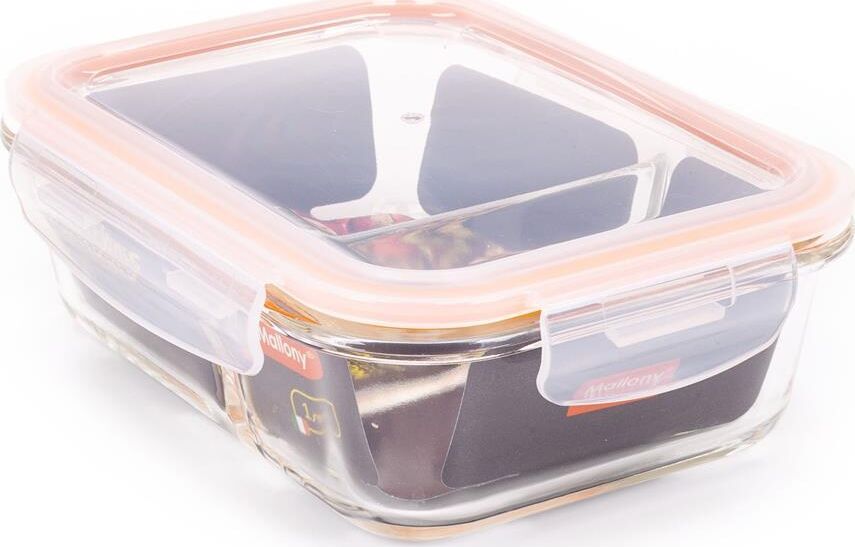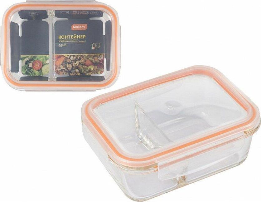 Контейнер, GUSTO,1000 мл прямоуг с разделителем, 2 секции, из жаропр стекла с плас крышкой/-40 +300С Материал: жаропрочное, боросиликатное стекло высокого качества, полипропилен, силиконовая прокладка. Объем 1000 мл. Инд упаковка: цветной вкладыш/коробка с ячейками. Цвет силикона: оранжевый. Крышка с защёлками и силиконовой прокладкой герметично прилегает к контейнеру, благодаря этому удобно использовать контейнер в том числе и для первых блюд. Предназначены для хранения и переноски готовых блюд, для разогревания и приготовления пищи в духовках и СВЧ без крышки, а также хранения продуктов в холодильной и морозильной камерах.