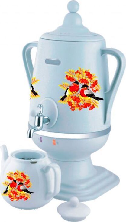 Самовар Объём: 4 л. Материал: пластик. Керамический заварочный чайник 1 л со съёмным фильтром из нержавеющей стали в комплекте/высота 145мм. Хромированный кран. Функция термопота. Мощность при закипании 1850 Вт. Мощность в режиме подогрева 100 Вт. Напряжение сети 220 В. Дисковый нагреватель, световая индикация работы, автоматическое отключение, защита от перегрева при выкипании воды.