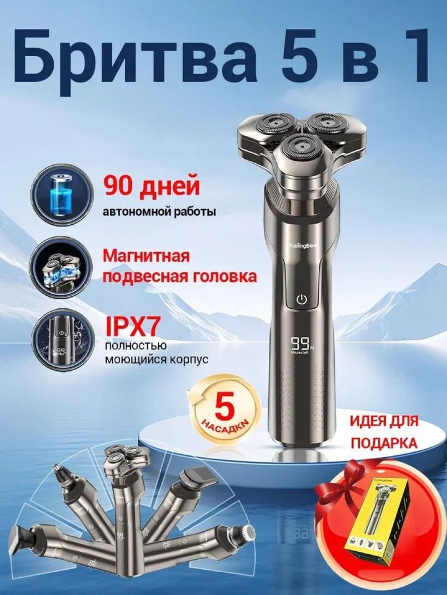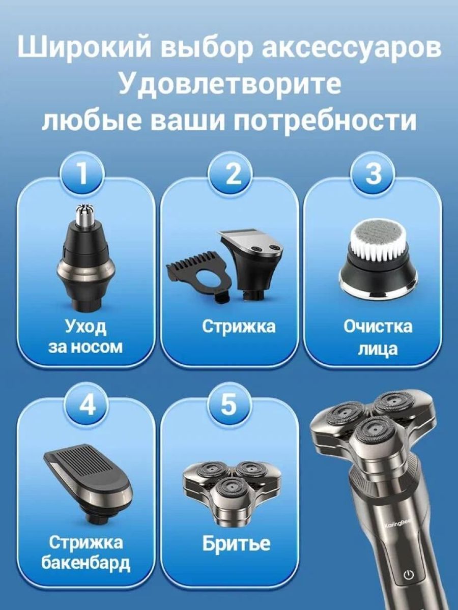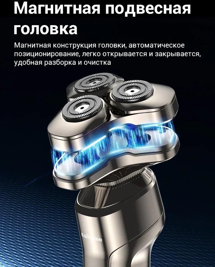 KaringBee Электробритва (серый) KB-5803 Способ бритья влажное, сухое Питание автономное Количество бреющих элементов 3 Плавающие головки да Подвижный бритвенный блок да Время работы от аккумулятора 120 мин Время зарядки аккумулятора 1.5 ч Скорость мотора 5000 об/мин Особенности Водонепроницаемый корпус да Индикация зарядки, остаточной зарядки Диапазон напряжения 220 Особенности триммер Габариты и вес Высота 200 мм Ширина 93 мм Толщина 75 мм Вес 170 г