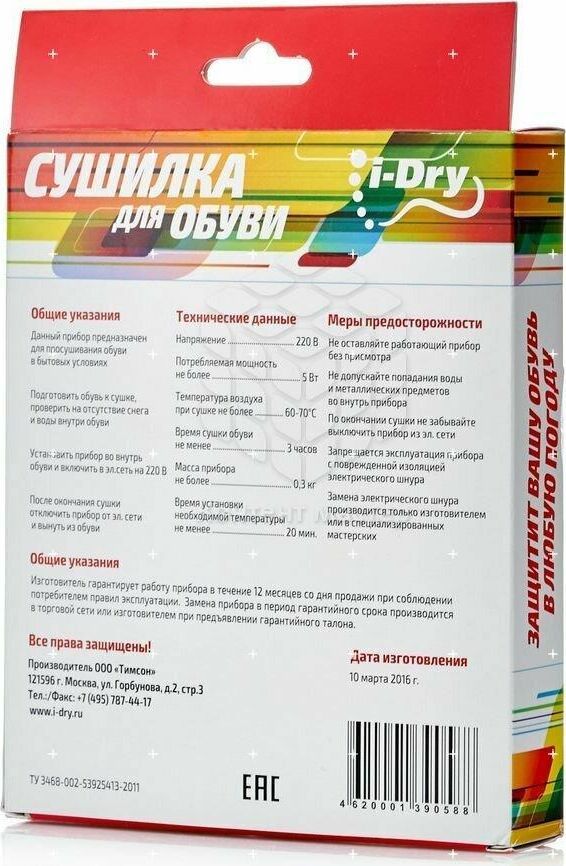 Напряжением 220В. Потребляемая мощность 5-7 Вт. Температура воздуха внутри обуви не более 60-70?С. Время сушки обуви - не менее 6-8 ч. Масса прибора - не более 0,4 кг. Время установки необходимой температуры - не менее 20 мин