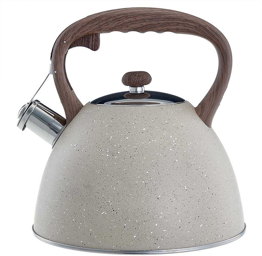 Объем 3 л Толщина стали 0,4 мм Чайник из нержавеющей стали со свистком Высококачественная нержавеющая сталь c цветным покрытием Цвет: бежевый гранит Термосберегающее индукционное дно Термостойкая бакелитовая ручка с противоскользящим покрытием и с кнопкой для открывания носика Цвет ручки: темное дерево Пригоден для использования на всех типах кухонных плит, включая индукционные Упаковка: цветная коробка
