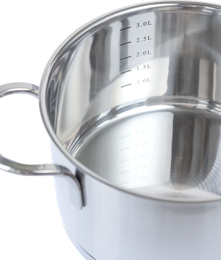 Из нержавеющей стали 18/10, подходит для использования в ПММ. Теплоемкое капсульное дно. Стеклянная крышка в комплекте. Подходит для всех типов плит. Мерная шкала на внутренней стенке