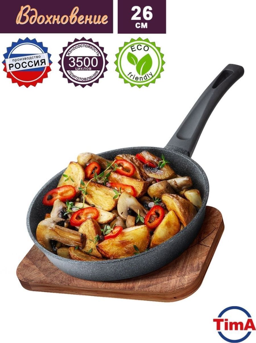 Сковороды изготовлены из пищевого алюминия современным методом литья с кристаллизацией под давлением и покрыты усиленным двухслойным антипригарным покрытием «Greblon Non Stick C2+» (Германия) толщиной около 30 мкм. Это покрытие выдерживает не менее 3,5 тысячи условных циклов приготовления пищи, что позволяет сковороде прослужить несколько лет. Увеличенная толщина дна (до 5 мм) и высокие стенки (55 – 65 мм) сковород позволяют не только жарить или разогревать различные блюда, но и тушить. Фиксированные эргономичные ручки с покрытием Soft-touch, не нагреваются. Сковороды серии «Вдохновение» изготовлены в современном дизайне, имитирующем камень, оригинально и стильно смотрятся в интерьере любой кухни.