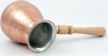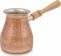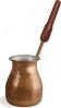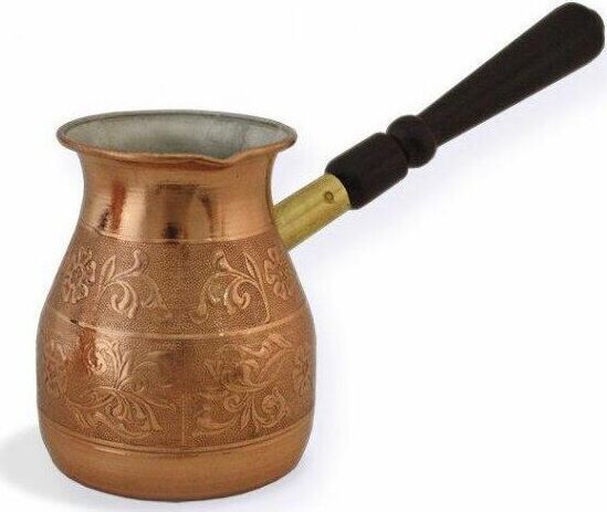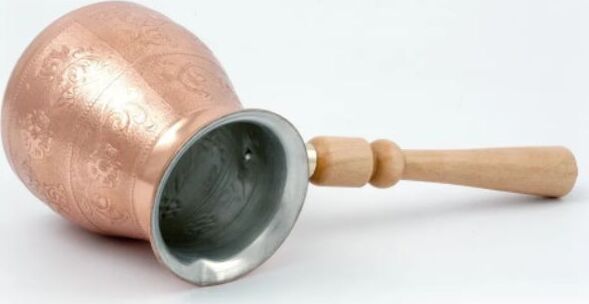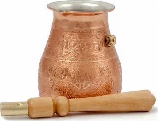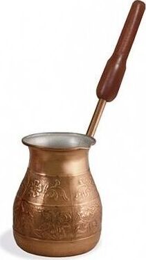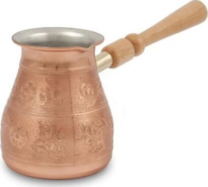 Турка изготовлена из меди, прекрасно подходит для приготовления настоящего кофе на плите. Внешняя поверхность имеет декоративное тиснение, что придает изделию оригинальный внешний вид. Внутренняя сторона покрыта пищевым оловом. Изделие оснащено небольшим носиком и удобной не нагревающейся деревянной ручкой с петелькой для подвешивания. Надежное крепление ручки гарантирует безопасное использование.