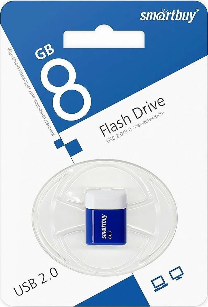 Флэш-накопитель, объем памяти 8 ГБ, интерфейс USB 2.0, скорость записи данных 5 МБ/с, скорость чтения данных 15 МБ, материал корпуса - пластик.