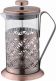 Френч - пресс - это устройство изначально использовавшееся для приготовления кофе, путем заваривания и отжима, включает в себя стеклянную емкость и поршень с фильтром. Для френч - пресса используют специально крупнопомолотый кофе. На данный момент френч - пресс широко применяется и для заваривания чая, настаивания трав и ягод. Это прекрасная альтернатива заварочному чайнику, пресс легко моется и не занимает много места на кухне.Френч-пресс изготовлен из устойчивого к перепадам температуры боросиликатного стекла. Ручка и крышка медного цвета не нагреваются, поэтому вы не рискуете обжечься. Это необходимая вещь для любого чаёвника или кофемана.