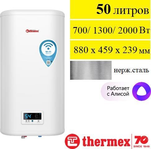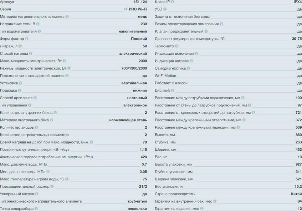 Материал нагревательного элемента медь Напряжение сети, В 230 Тип водонагревателя накопительный Форм-фактор Плоский Литраж, л 50 Способ нагрева электрический Макс. мощность электрическая, Вт 2000 Режимы мощности электрической, Вт 700/1300/2000 Установка вертикальная Подводка нижняя Способ крепления настенный Тип управления электронное Количество внутренних баков 2 Материал внутреннего бака нержавеющая сталь Сухой ТЭН нет Количество анодов 2 Количество нагревательных элементов2 Время нагрева на ∆t 45° при макс. мощности, мин. 79 Макс. давление воды, МПа0.7 Мин. давление воды, МПа 0.05 Макс. температура нагрева воды, °С 75 Присоединительный размер G1/2 Ускоренный нагрев да Класс IP IPX4 УЗО да Защита от включения без водыда Режим предотвращения замерзания да Клапан предохранительный да Диапазон регулировки температуры, °С30-75 Термометр да Индикация включения да Индикация нагрева да Самодиагностика да Дисплей да Высота, мм880 Глубина, мм263 Ширина, мм452 Вес, кг13