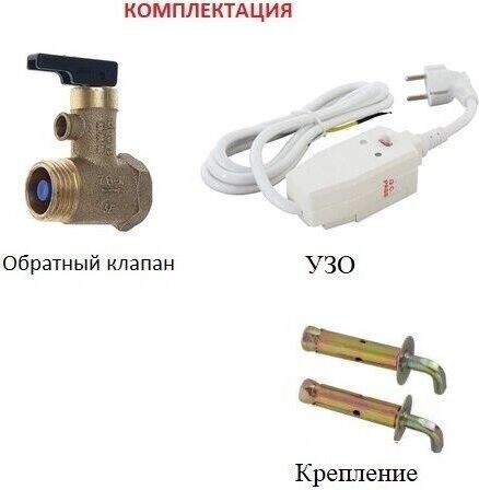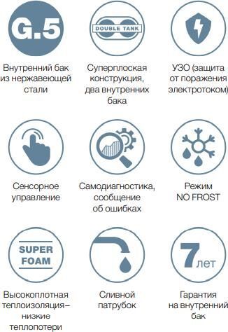 Системы защиты: УЗО, обратный клапан, от включения без воды, от перегрева, предохранительный клапан, режим предотвращения замерзания, Анод, самодиагностика