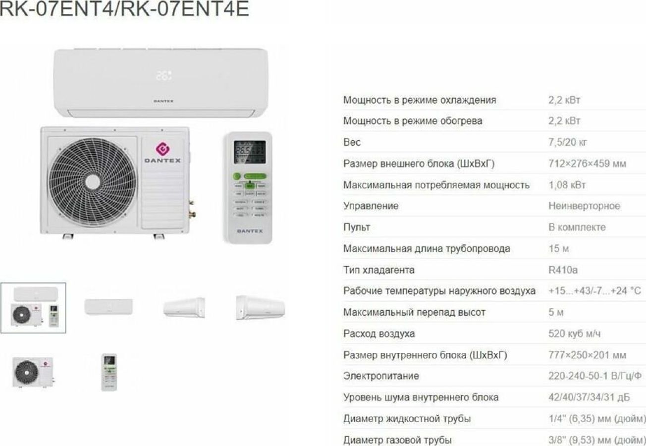 Мощность в режиме охлаждения 2,2 кВт Мощность в режиме обогрева 2,2 кВт Потребляемая мощность (макс.) 1080 Вт Размер внутреннего блока (ШхВхГ) 777×250×201 мм Размер внешнего блока (ШхВхГ) 712×276×459 мм Вес внутреннего блока 7,5 кг Вес внешнего блока 20 кг Управление Неинверторное Пульт В комплекте Максимальная длина трубопровода 15 м Тип хладагента R410a Рабочие температуры наружного воздуха +15...+43/-7...+24 °С Максимальный перепад высот 5 м Расход воздуха 520 куб м/ч Электропитание 220-240-50-1 В/Гц/Ф Уровень шума внутреннего блока 42/40/37/34/31 дБ Диаметр жидкостной трубы 1/4'' (6,35) мм (дюйм) Диаметр газовой трубы 3/8'' (9,53) мм (дюйм)