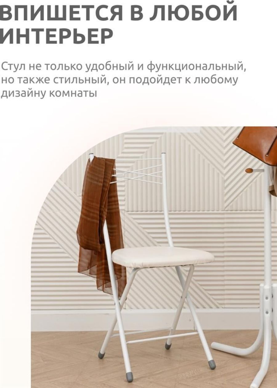 Преимущества: удобная спинка мягкое сиденье простой механизм складывания материал сиденья прочный, устойчивый к истиранию и легкий в чистке пластиковые колпачки на ножках защищают поверхность пола от царапин допустимая нагрузка не более 100 кг Характеристики: габаритные размеры в разложенном виде (ДхШхВ): 545х395х890мм габаритные размеры в сложенном виде (ДхШхВ): 1010х395х105мм размер сиденья (ДхШ): 395х400мм высота до сиденья: 480±3мм ширина спинки: 395мм диаметр трубы: 20мм вес: 4,5кг Материал: каркас - стальная труба сиденье - винилискожа основание - ДСП колпачки на ножках - пластик