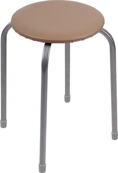 На 4-х опорах, мягкое круглое сидение, легко штабелируются, материал сиденья прочный, устойчивый к истиранию и легкий в чистке, пластиковые колпачки на ножках защищают поверхность пола от царапин, допустимая нагрузка не более 100кг , каркас - стальная труба, сиденье - винилискожа, основание - МДФ, колпачки на ножках - пластик.