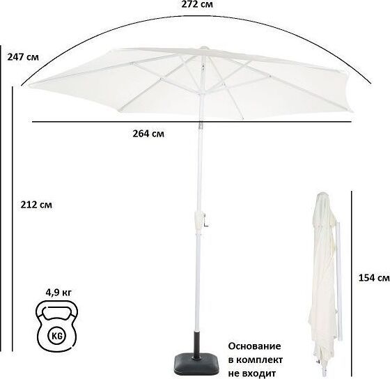 Зонт Green Glade – незаменим для отдыха на даче, загородном участке, около бассейна и на пляже. Он защитит вас и ваших детей в жаркий день от яркого солнца и создаст комфортную тень там, где вам необходимо. Купол имеет свойство наклона, поэтому его можно регулировать. Перед использованием зонт необходимо надежно закрепить в основание для зонта. Основание в комплект поставки не входит. • Длина дуги купола: 272 см • Диаметр: 264 см • Высота (общая/до купола): 247/212 см • Вес нетто: 4,9 кг • Стойка: сталь 34/36 мм • Наклонный механизм: цинковый • Количество спиц: 6 штук • Спица: 12х18 мм • Материал: 180G полиэстер • Система поворота • Вентиляция • Чехол п/э • Цвет: белый • Размер коробки: 155х13,5х13,5 см • Количество в коробке: 1 штука • Вес брутто: 5,5 кг • Производитель: Green Glade • Страна: Китай