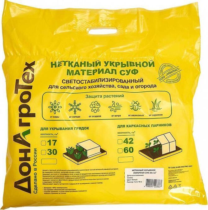 Параметры Длина 10 м Ширина 3,2 м Плотность 30 г/м? Описание Легкий и прочный, устойчивый к ультрафиолету экологически чистый нетканый укрывной материал СУФ светостабилизированный для сельского хозяйства, сада и огорода Не подвержен гниению, пропускает воздух и воду Защищает растения от насекомых и птиц, а также от воздействия негативных погодных условий Применяется для укрывания грядок и теплиц при выращивании овощных культур для создания оптимального микроклимата и увеличения урожайности Защищает овощные, фруктовые и декоративные растения в открытом грунте от ожогов и перепадов температур Обеспечивает защиту кустарников и деревьев от вымерзания в зимний период Материал: 100% полипропилен Цвет: белый Упаковка: пакет Производитель: Россия