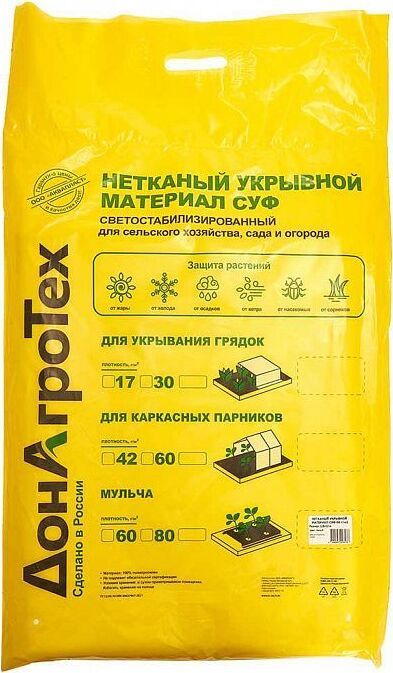 Параметры Длина 10 м Ширина 3,2 м Плотность 60 г/м? Описание Мульча СУФ - экологически чистый нетканый материал для сельского хозяйства, сада и огорода Служит прекрасным мульчирующим средством, предотвращает перегрев почвы летом и промерзание зимой Не подвержен гниению, пропускает воздух и воду, прост в применении Защищает грунт от пересыхания и выветривания, сохраняет внесенные удобрения и подкормки, препятствует росту сорняков Материал: 100% полипропилен Цвет: черный Упаковка: пакет Производитель: Россия