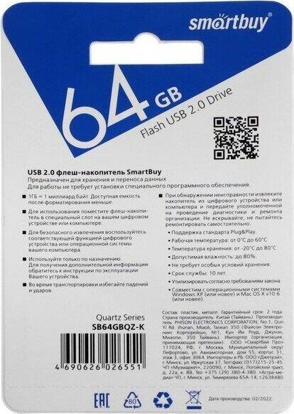 Компактный флэш-накопитель QUARTZ - один из самых стильных, объем памяти: 64 ГБ, интерфейс: USB 2.0, поддержкаWindows 10/8/7/XP/2000/Vista, Mac OS 8.6 и Linux 2.4.0 (или выше).