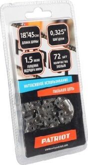 Высокопроизводительная цепь со стандартным профилем (под паз 1,5 мм) для пил средней мощности. • Металл цепи проходит дополнительную термическую обработку для увеличения ресурса и придания прочности. • Режущая поверхность зуба имеет риску для индикации критического уровня износа, при достижении которого, цепь необходимо заменить. Количество звеньев, шт 72. Шаг цепи, дюйм 0,325. Толщина ведущего звена, мм 1.5.