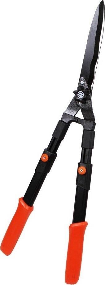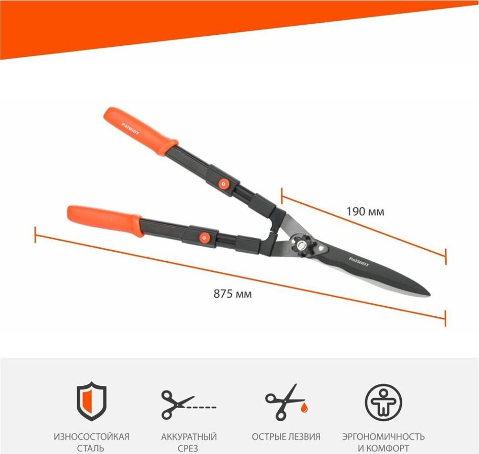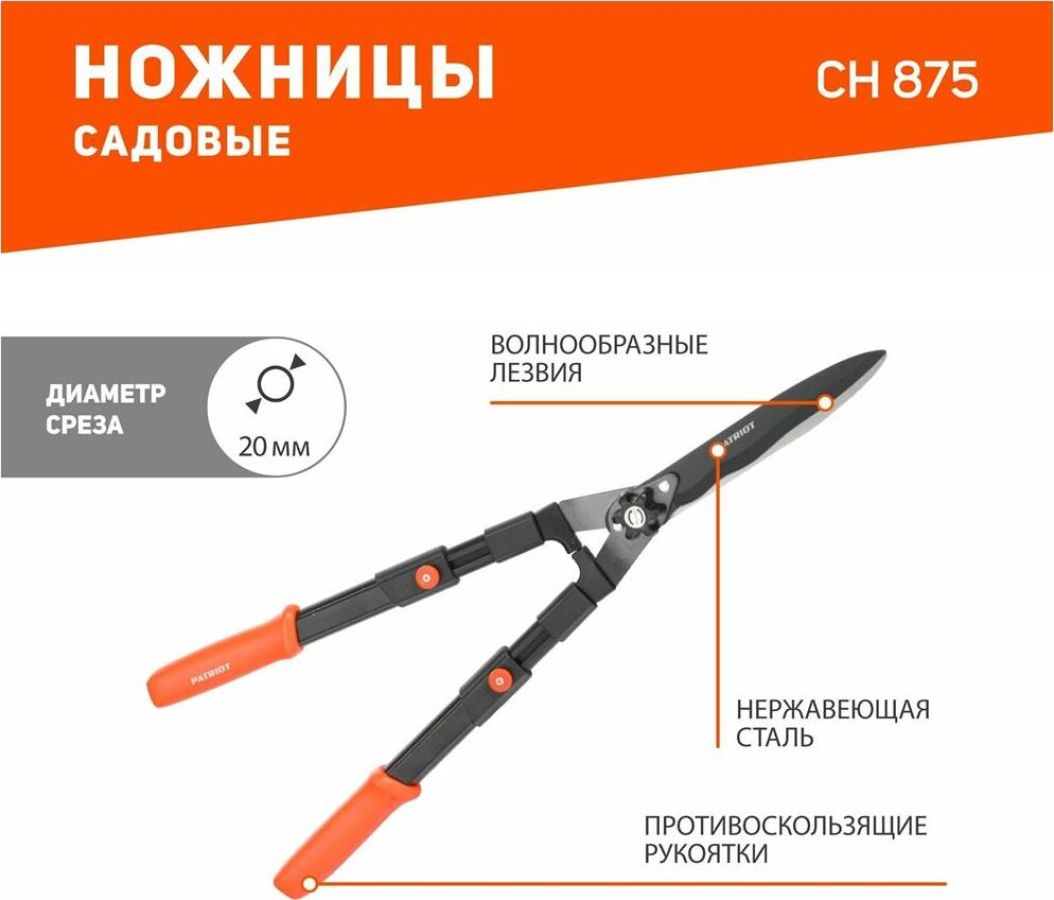 Ножницы для живой изгороди PATRIOT CH 875 777006875 оснащены плоскими лезвиями и удобной системой передачи энергии от рукоятей к режущим кромкам. Волнообразная поверхность исключает зажевывание при резке тонких веток или одновременном перерезании нескольких веток одновременно. Для защиты пальцев от прищемления есть специальный стопор, который не дает рукояткам полностью сомкнуться. Максимальный диаметр реза, мм 20 Длина режущей части, мм 190 Материал лезвия сталь Покрытие лезвий окрашенные Волнистые лезвия да Материал рукояток пластик Общая длина, мм 875 Вес, кг 1,38