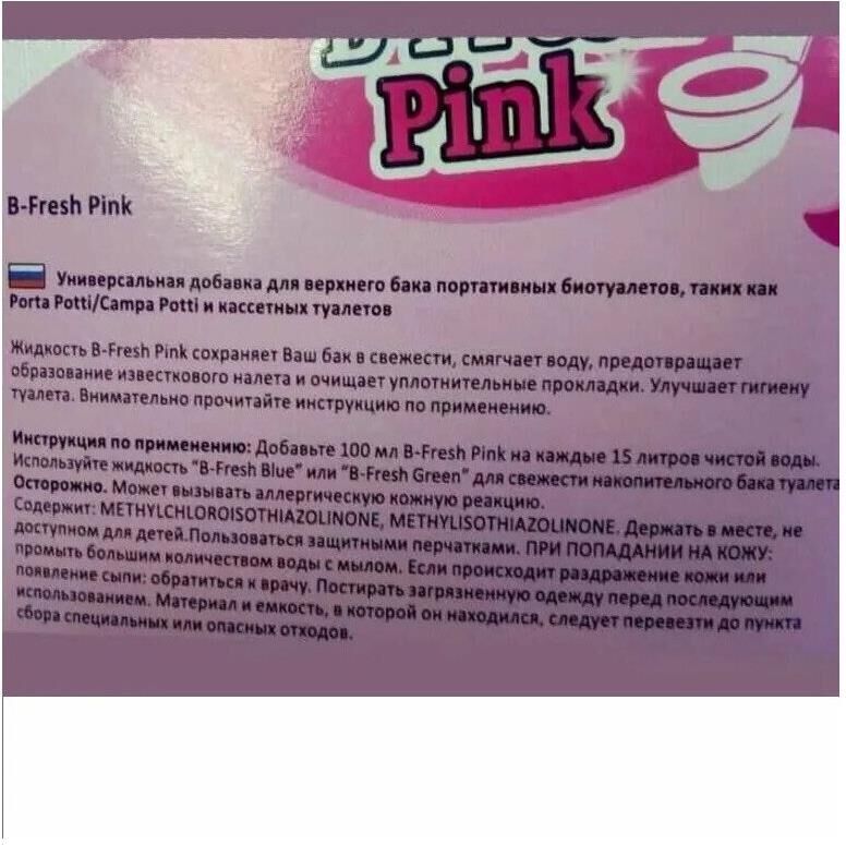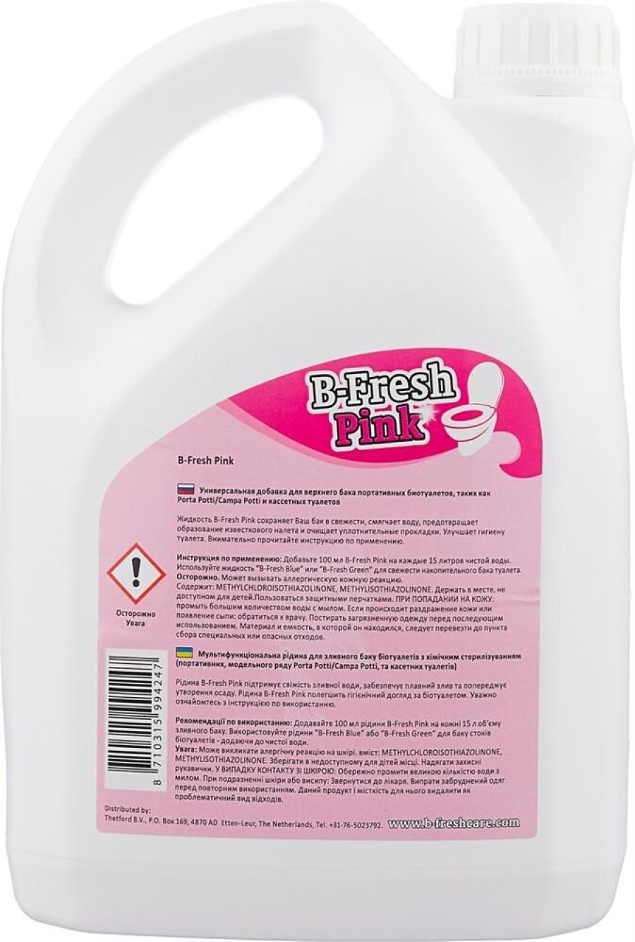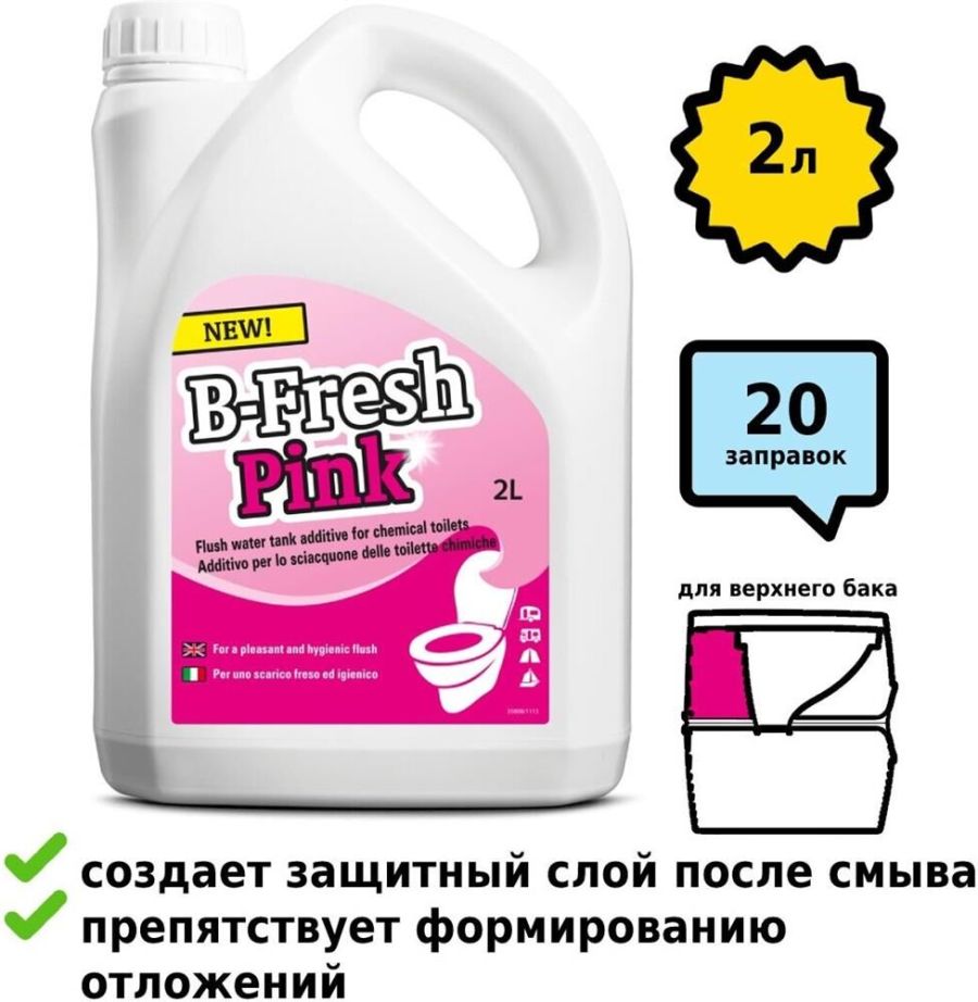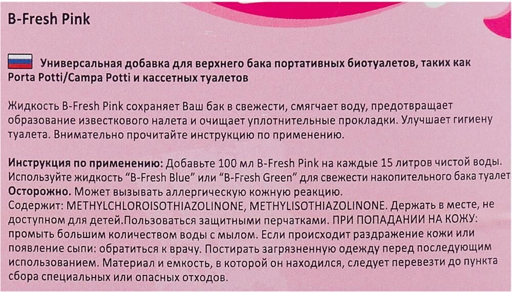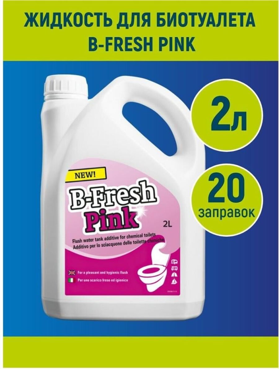 Туалетная жидкость Thetford B-Fresh Pink – это добавка розового цвета для верхнего бака биотуалетов. Благодаря своему биологическому воздействию, после смыва воды на поверхности унитаза остается защитный слой, который препятствует формированию отложений и смазывает резиновое уплотнение клапана. • Вес нетто: 2,118 кг • Объем: 2 л •Количество в упаковке: 4 штуки • Размер упаковки: •Вес брутто упаковки: 8,990 кг •Объем упаковки: 0,019 м3 •Производитель: Thetford • Страна: Нидерланды