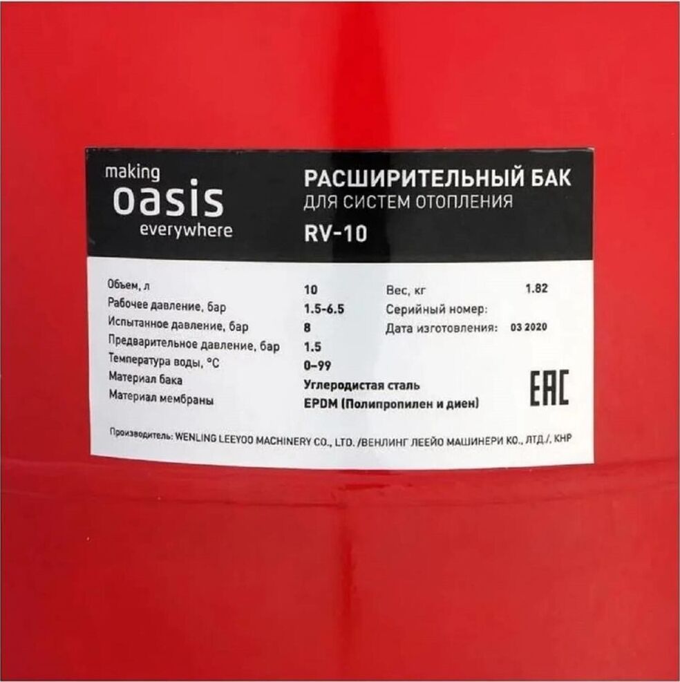 Объем, л10. Рабочее давление, бар 1.5-6.5. Испытанное давление, бар 8. Минимальная температура, °С 0. Максимальная температура, °С 99. Предварительное давление, бар 1.5. Материал бака Углеродистая сталь. Материал мембраны EPDM (Полипропилен и диен). Вес нетто, кг 1,82. Производство Китай.