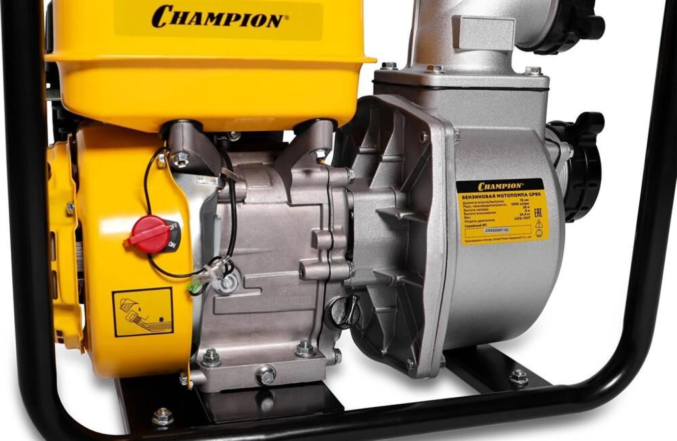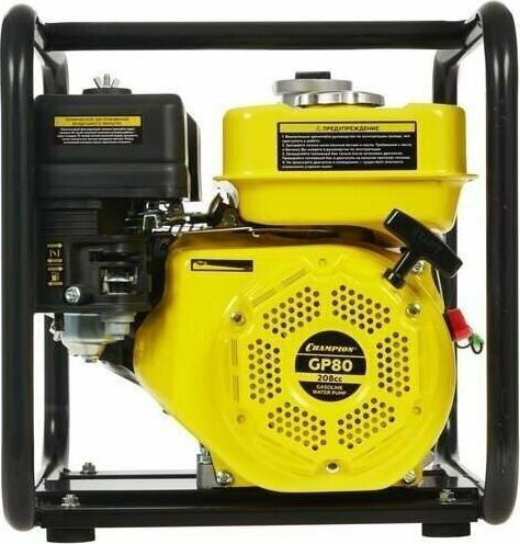 Мотопомпа оснащена четырехтактным двигателем объемом 208см3, который позволяет перекачивать 10000 литров воды в минуту. Мотопомпа оснащена обратным клапаном, который предотвращает всасывание воды из корпуса насоса. Это способствует достаточному количеству воды в корпусе насоса для следующего запуска помпы. Технические характеристики Champion GP80 Высота подъема, м 28 Объем двигателя, см3- 208 Производительность, л/мин 1000 Габариты, мм 517x415x452 Тип для чистой воды Стартер ручной Мощность (Вт), Вт 4500 Модель двигателя UP168 OHV Производитель двигателя Champion Диаметр выходного отверстия (мм) 80 Тип двигателя бензиновый Вес, кг 30 Диаметр входного отверстия, мм 80 Емкость топливного бака, л 3.6 Двигатель Champion UP168 OHV Высота всасывания, м 8 Тактность двигателя 4-х тактный Вид пожарная мотопомпа Мощность (л.с.), л.с. 6,5