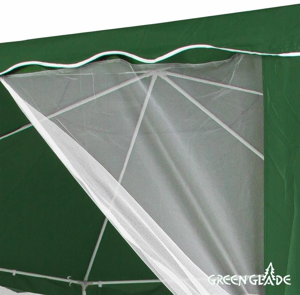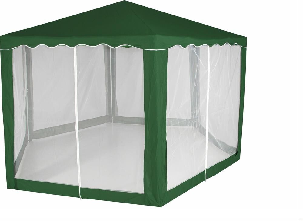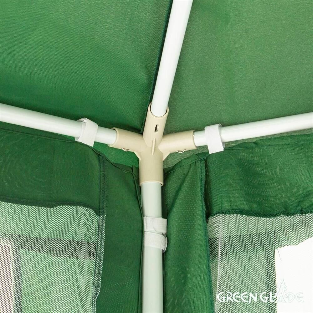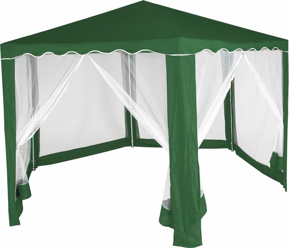 Тент садовый из полиэстера – практичное и популярное решение для использования на даче, пикниках, шашлыках и кемпинге. Крыша тента защитит от солнца, а москитные сетки избавят от насекомых. Тент садовый из полиэстера быстро и несложно монтируется и закрепляется с помощью растяжек. • Размер: 2х2х2х2,6 м •Цвет: зеленый •Материал: полиэстер 160 г •Каркас: металлическая трубка (18х18х24 мм) •Москитная сетка: да •Вес брутто: 10 кг • Размер упаковки: 110х16х23 см