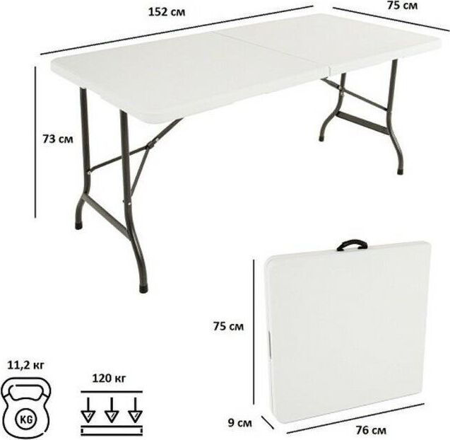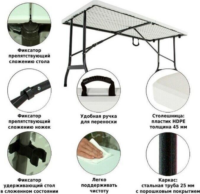 Стол раскладной, выполнен из качественного пластика, каркас - сталь. Складывается в одно движение. В сложенном состоянии очень компактный. В дождь, на зиму или пока вас нет на даче можно убрать. Стол подойдет как для дачи или сада, так и для помещения. Не боится влаги. Есть возможность фиксации ножек. • Размер - 183х74х74см •толщина 5 см •Вес брутто/нетто 15,5/14,5 кг. • Размер коробки: 92*76,5*9 см •Материал пластик+ металл.
