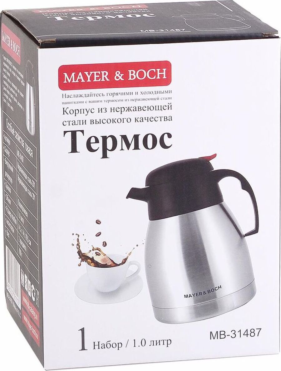 Термос МВ (х12). Корпус: нержавеющая сталь. Внутренняя колба: нержавеющая сталь. Крышка: полипропилен. Цвет: серебристый. Объем: 1 л. Диаметр: 14 см. Высота: 19 см. Диаметр горлышка: 6,5 см. Размер упаковки: 14,5 х 14 х 19,5 см. Упаковка: коробка. Вес: 702 г. Страна-изготовитель: Китай.