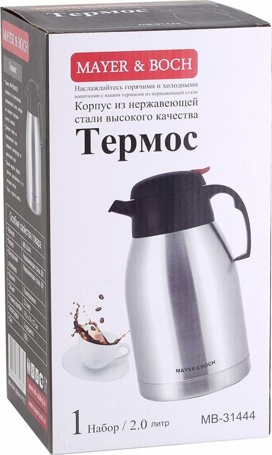 Термос МВ (х12). Корпус: нержавеющая сталь. Внутренняя колба: нержавеющая сталь. Крышка: полипропилен. Цвет: серебристый. Объем: 2 л. Диаметр: 14 см. Высота: 26,5 см. Диаметр горлышка: 6,5 см. Размер упаковки: 14,5 х 14 х 27 см. Упаковка: коробка. Вес: 972 г. Страна-изготовитель: Китай.